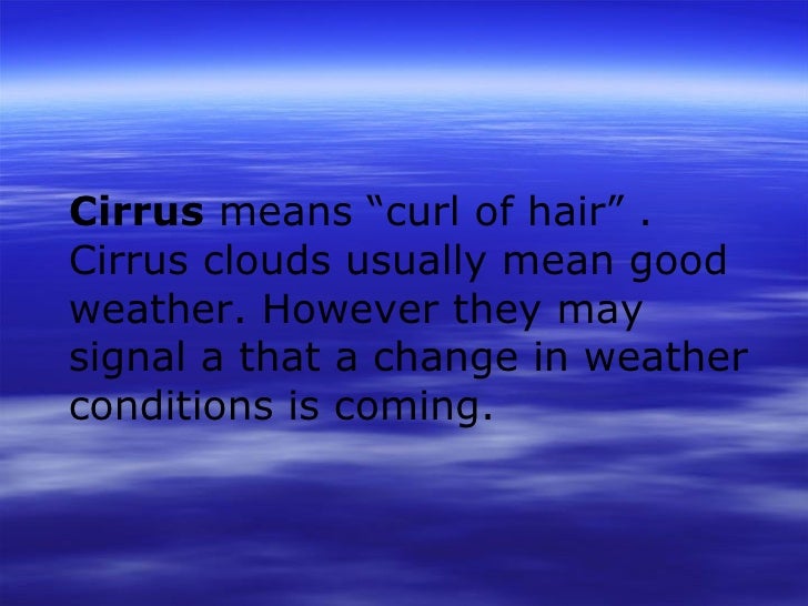 Cirrus clouds are composed almost exclusively of nonspherical ice crystals, with a wide range of shapes, such as columns, plates, hollow columns, bullet this is because while cirrus and cirrostratus clouds usually contain small, hexagonal 'prism' crystals such as thick plates, short solid columns. Cirrus derives its meaning from the latin language which means ringlet or curling lock of hair. These clouds can mean an overcast day or steady rain. The filamentous calligraphy of cirrus clouds scrolling high across the sky is a sure sign of a good day. Cirrus clouds may not be as pretty in appearance as some other types of clouds, however they are a very commonly occurring type of cloud.